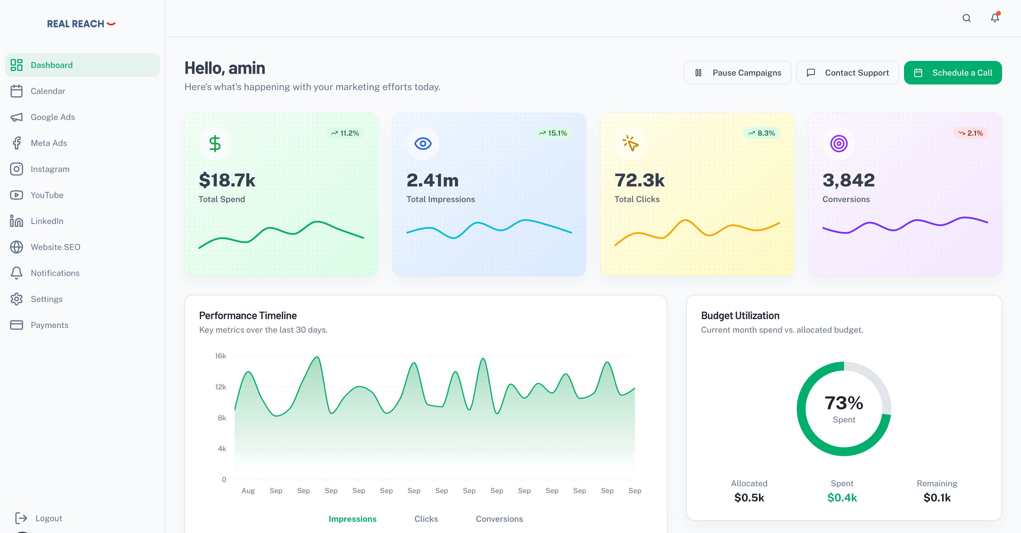 In your dashboard you can see all your marketing efforts across different channels like Google, Meta, Website SEO and analyze the performance of your campaigns as they are running. This feature enables us to clearly give our detailed reports to you, and analyze our efforts to optimize your marketing strategy as we move forward.
